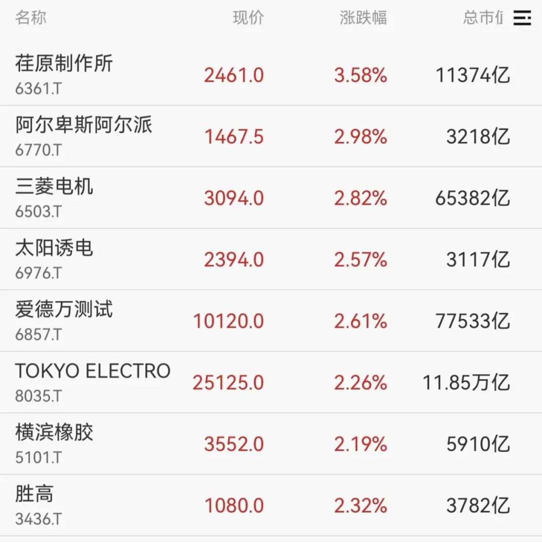 个股方面,电子和券商类股票领涨,三菱电机、爱德万测试、东京电子等均涨超2%。