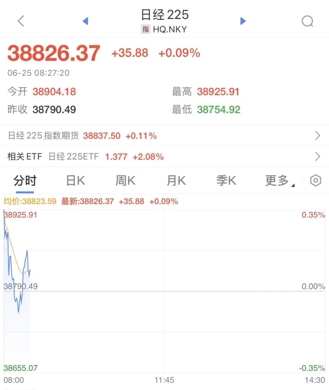 6月25日,日经225指数高开后走势震荡,截至发稿,日经225指数涨0.09%,报38826.37点。