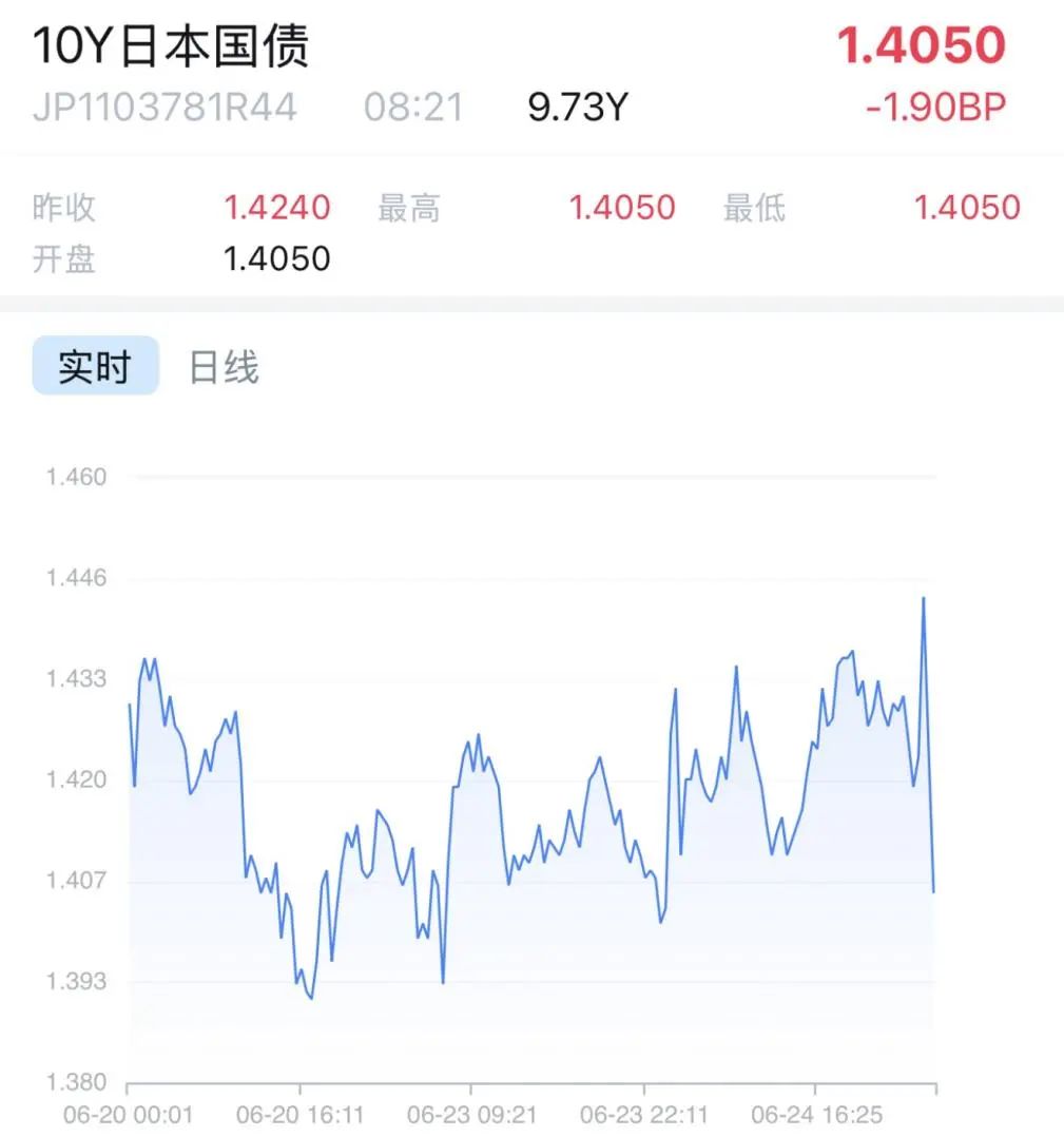 此外,日本10年期国债收益率下跌至1.4%,20年期国债收益率下跌2个基点至2.32%。