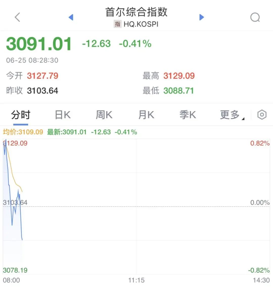6月25日早间,日韩股市高开。韩国KOSPI指数高开,随后短线下挫至3091.01点。
