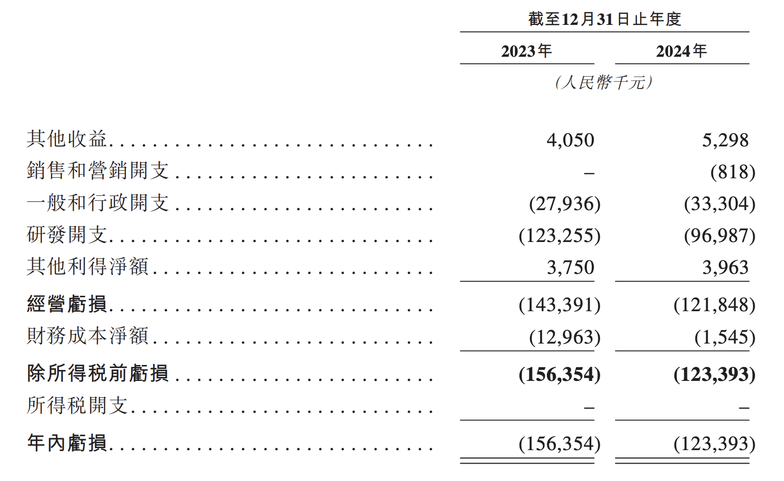 公司几乎所有的运营亏损均来自于研发项目的成本以及与运营相关的一般和行政开支。2023年和2024年,公司的研发开支分别为1.23亿元和9700万元,而于相同年份的一般和行政开支分别为2790万元和3330万元。